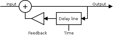Ce plugin produit un effet flanger. Je vous laisse voir la page wikipedia qui en parle pour comprendre de quoi il s'agit. Le diagramme bloc est celui du chorus auquel j'ai ajouté un feedback (rétroaction) sur le délais.